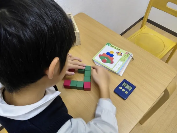 キューブブロックを使った課題は、空間認知や構成能力を育む効果も期待できます。他にも目と手の協調性運動や非言語的推論能力なども身についていきます。