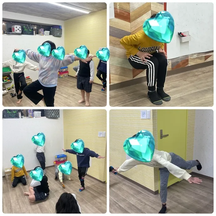 隣の友達にあたらないぐらいに散らばって、ポーズをとり動いてしまったら座っていきます🙌