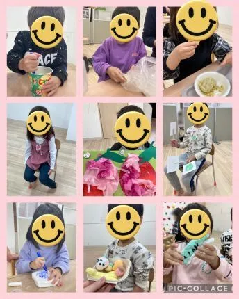 見本をヒントに丁寧に作る子、自分の発想で新種(!?)のフルーツを生み出す子もいて、テーブルが小さな果物店みたいに賑わいました🍊🍇