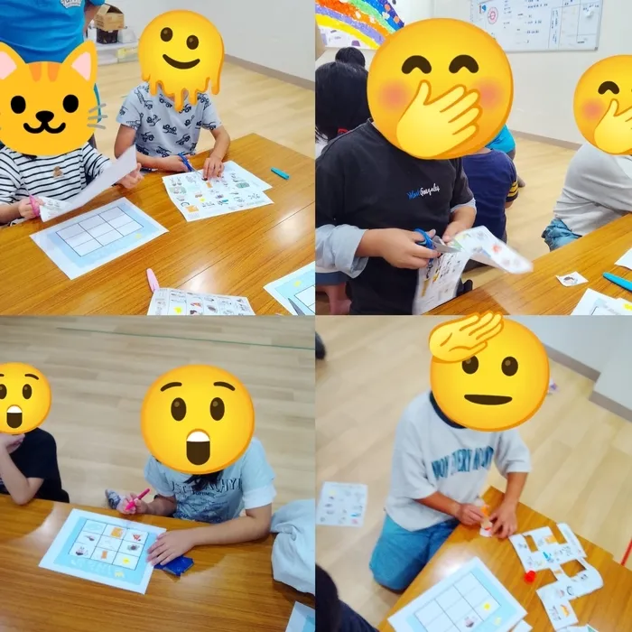 擬音語のプリントから9個を選んで、ビンゴカードに貼り付けるところから行なっています✂