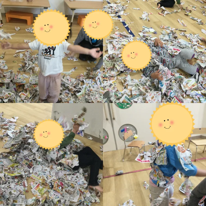 まずは、思いっきりチラシ破り!ビリビリ、くしゃくしゃ…と、大きな音を立ててチラシを破っていくのが楽しくてたまりません!🎉 たくさん破ったチラシを集めて、上から**「紙の雨」**を降らせてもらいましたよ☔️ 軽くてふわふわした紙の感触が顔や体に当たるたび、みんな大喜び!笑顔が溢れていました💖 自分の手で紙を破るという単純な動作が、手先の力や集中力を養ってくれます。