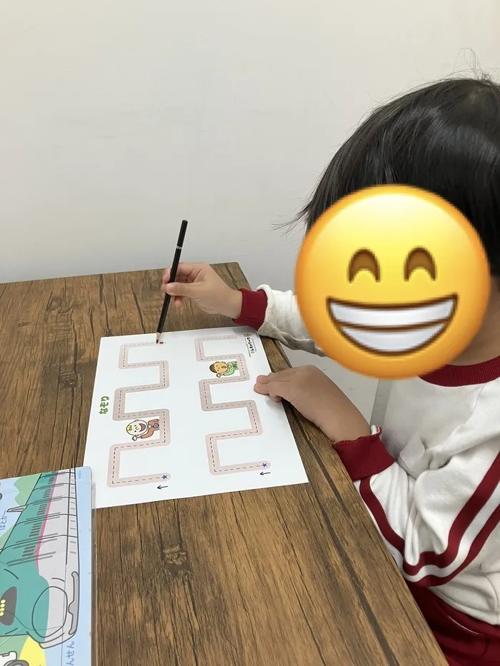 なぞり書きは鉛筆の持ち方が以前は見本を見せてもそのままでしたが今回は、一度正しい持ち方を見せると自分で持ち方を修正してなぞり書きをしています✨