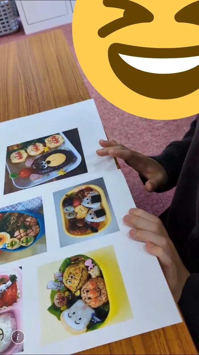お弁当などの写真を見ながら、「アンパンマン」「ぐみ」…