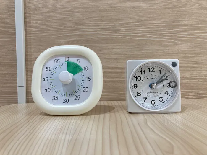 例えば、ブロック遊びに夢中になっているお子さまに、「お片付けしよう」と声をかけるのと一緒に、「おわり」と書かれたカードや、残り時間が分かるタイマーを見せます。