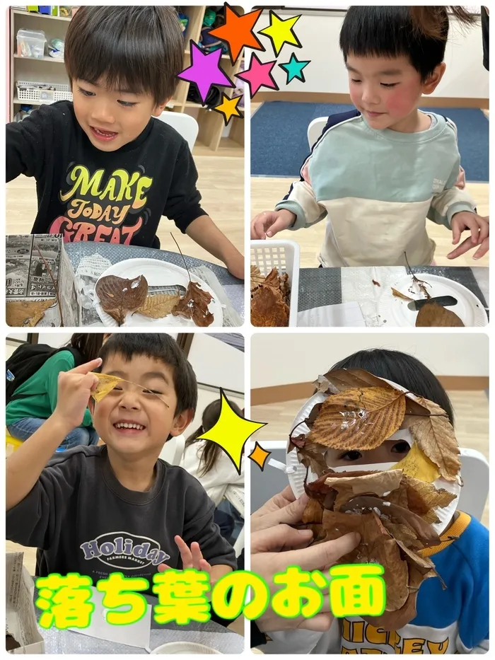 拾った落ち葉🍂を使ってお面工作を行いました!