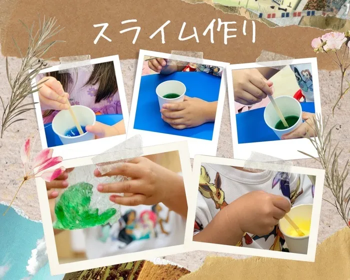自由遊びの時間には、スライム作りを楽しみました。それぞれ好きな色に作り、手でこねたり、さまざまな形に変えたりしながら夢中になって遊んでいました。