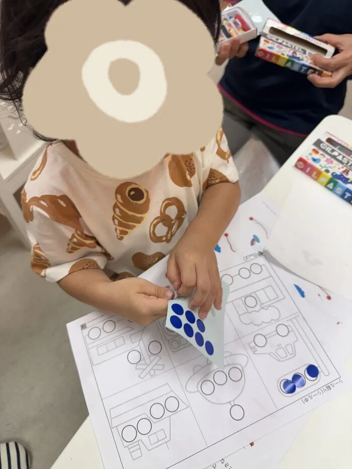 個別療育の時間に、モンテッソーリの考えを取り入れたシール貼りあそびを行いました✨