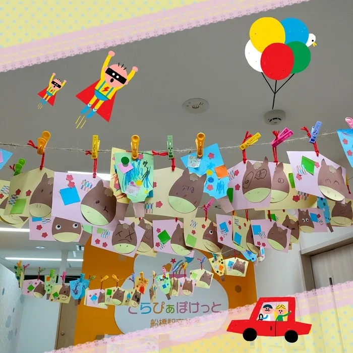馬の顔を描いたり折り紙やお花で模様をつけました❣️様々な表情の馬がいてどの作品もステキです😊