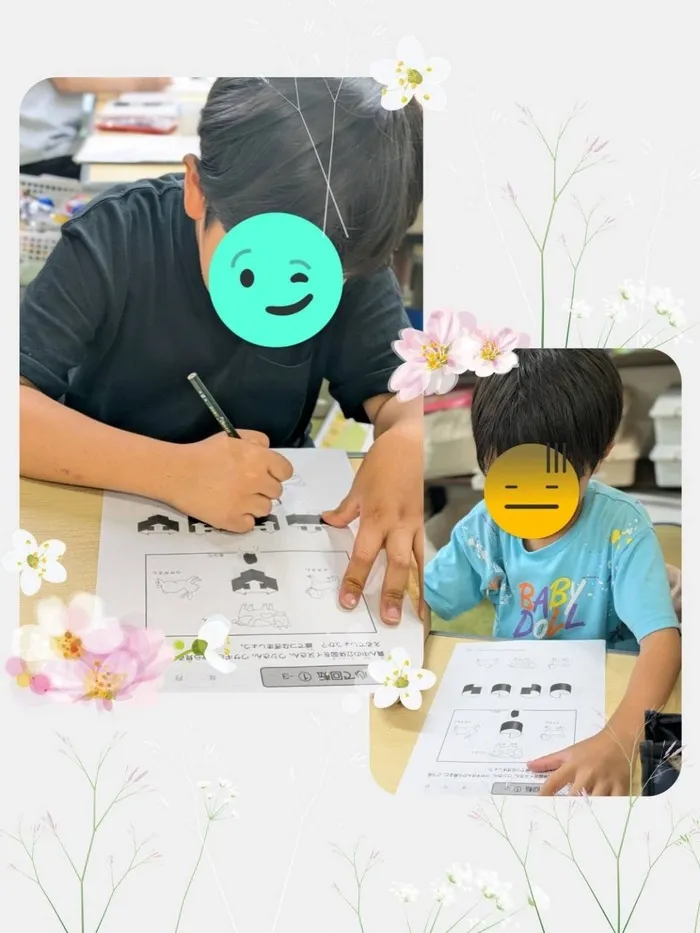 プリントに書かれた立体図形を、四方向から見た場合の対応する形を見つけ出すものです。平面を立体的にとらえ、イメージする力が必要になります🧐✏️