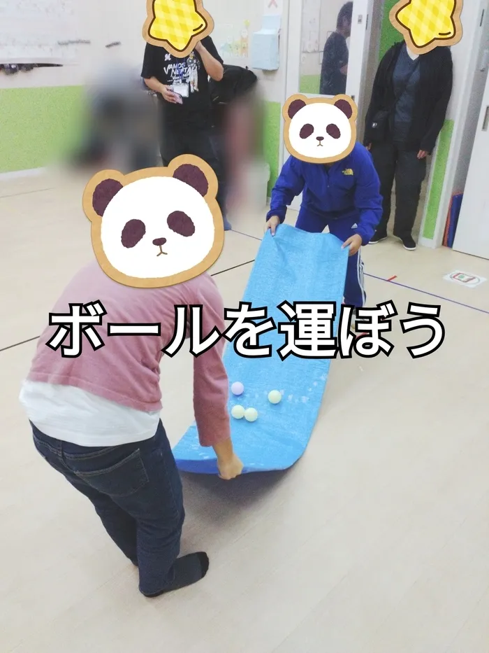 ビニールシートにボールをのせ、二人で協力して運ぶ活動です。