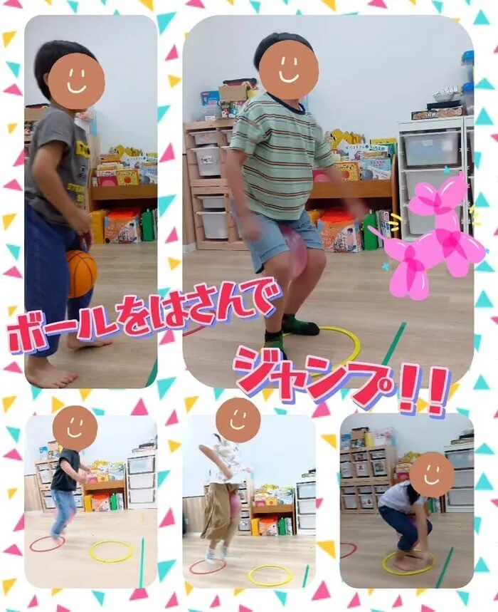 膝にボールをはさみ輪の上をジャンプジャンプ🎶
