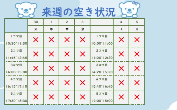 1日の利用上限の関係で空き無しの日も多くありますが、時間変更等承れる場合があります。