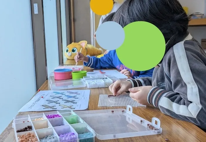 また、ビーズは、細かく小さいため、指先を器用に使ったり、ピンセットを使用しないと上手く扱えないのですが、集中して取り組み、素敵な作品が続々とでき上がっていきます。