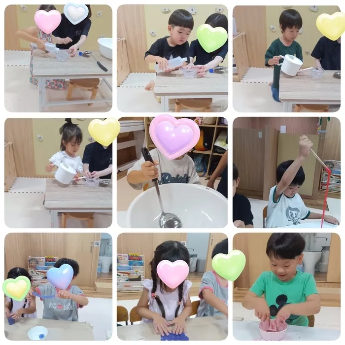 スライムの状態が変化していく不思議さ感触、自分たちで作る楽しさをみんなで一緒に味わうことができて嬉しいです😊