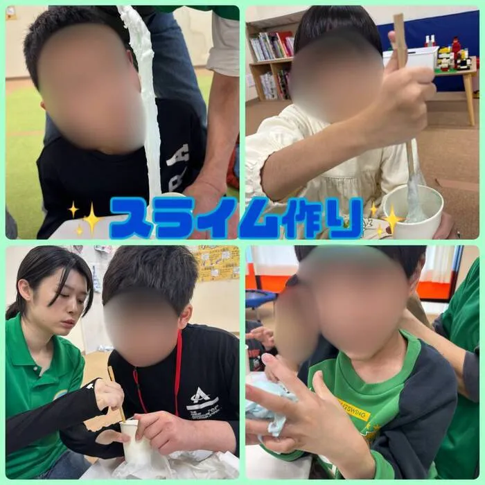 みんなは、シェービングクリームを使った少し変わった感触の製作を楽しまれました。いつものスライムとの違いに、「ふわふわだね」「マシュマロみたい!」と、驚きの声が上がりました😊