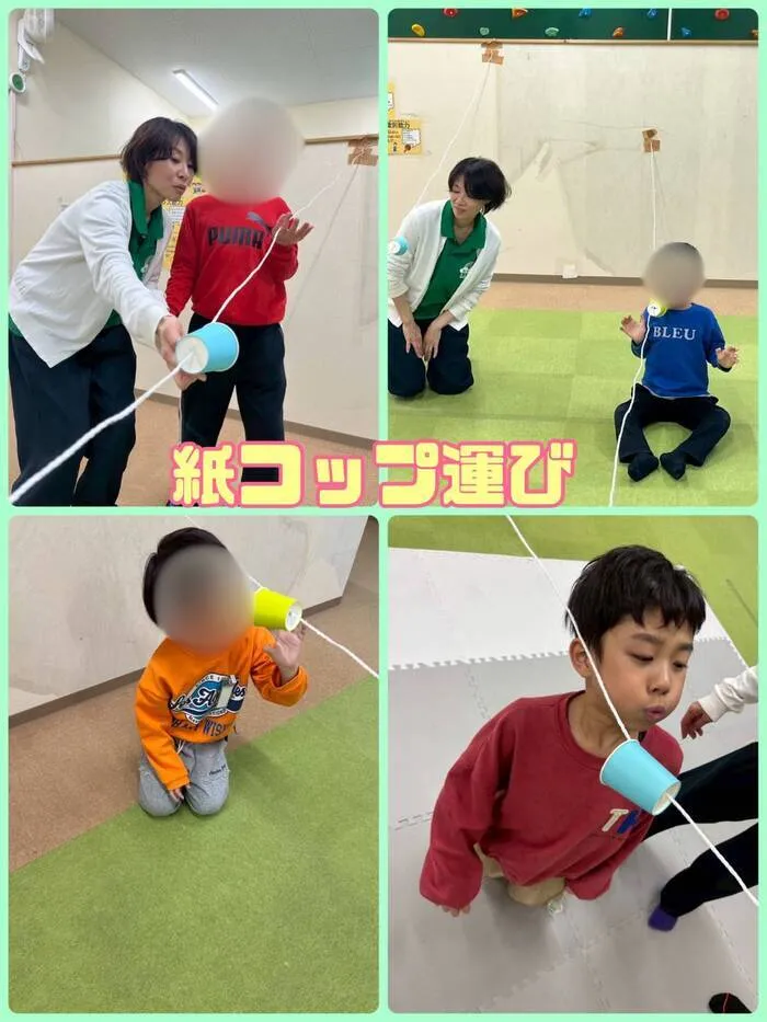 紙コップの底に開けた穴に通した麻紐を壁に固定し、紙コップを前に進めるために息をフーフーと吹きかけて取り組んでいました🌬