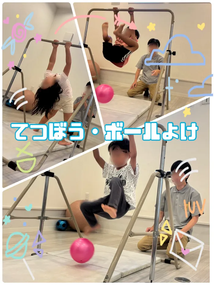 鉄棒にぶら下がり、転がってきたボールをよけてもらいます🤸