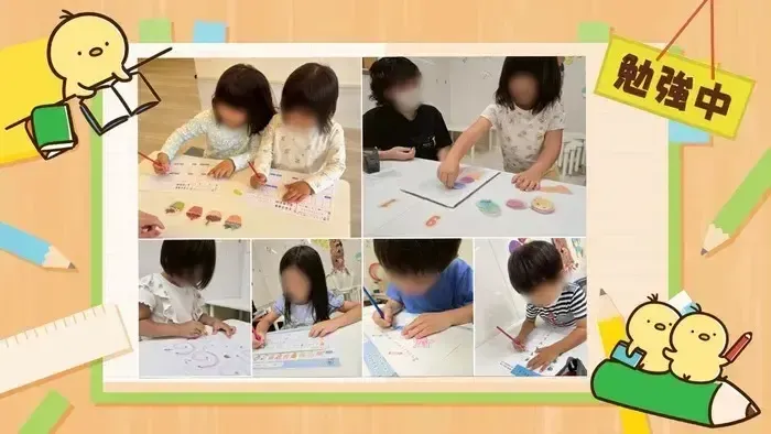未就学児の子どもたちはおやつの前にお勉強をしています_φ(・_・