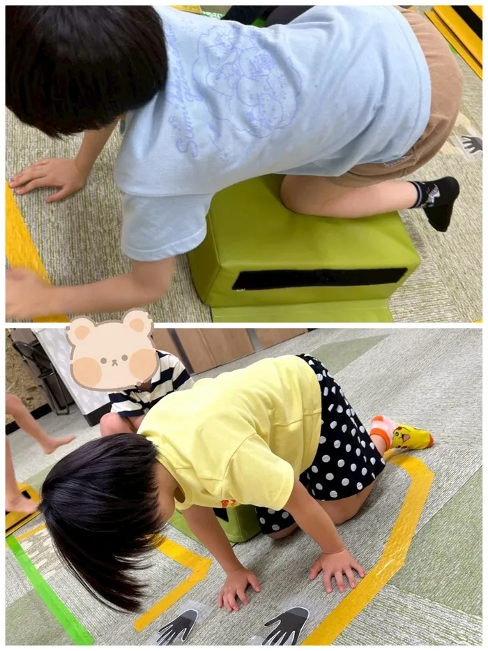 中々四つん這いをしない子がいる中、活動に取り入れてスタッフが見本でやってみるとそれを見た子どもたちも一緒にやってくれる姿もありました!