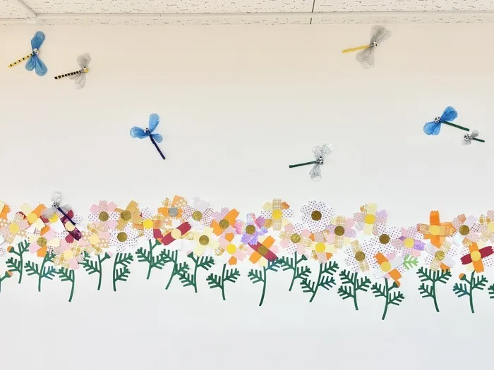 職員が作ったトンボも飛ばせると、とても9月らしい壁面になりましたね!