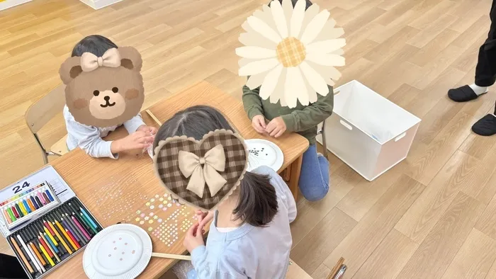 職員がどんぐりと紙皿、割り箸を使ってでんでん太鼓を準備しました。そのでんでん太鼓にシールを貼ったり、お絵描きをしたり、オリジナルのでんでん太鼓を作りました!