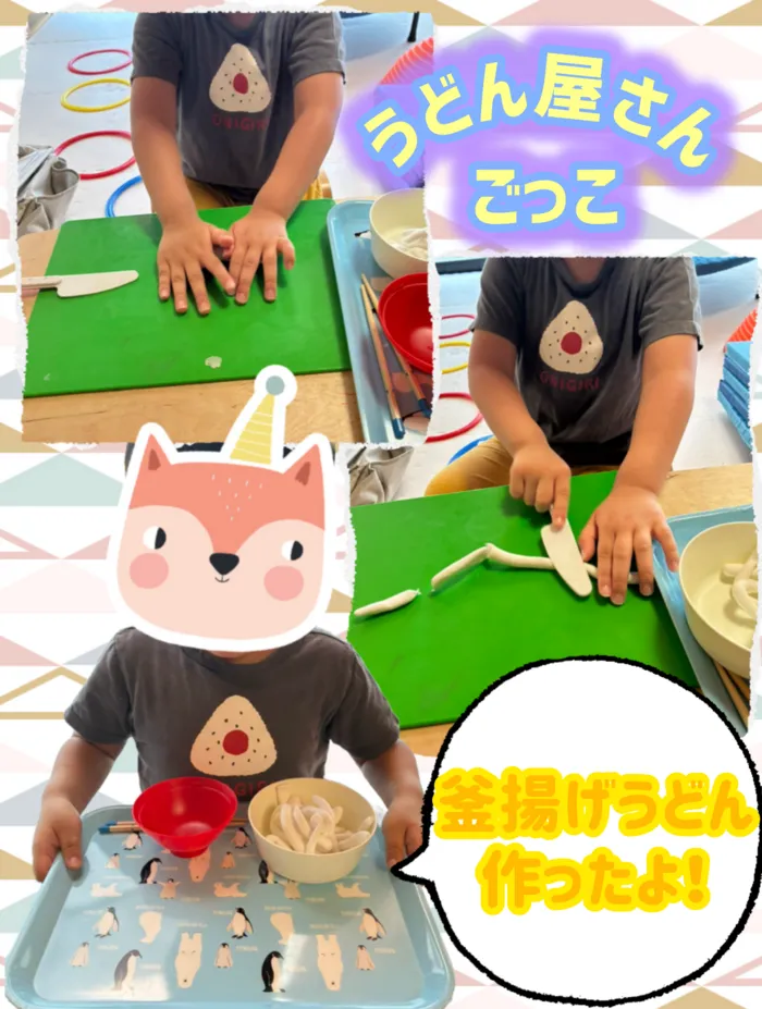 うどんを作っていると、「桶も作らなくちゃ!」と言って、きちんとお盆に載せたうどんセットを完成させてくれました👏