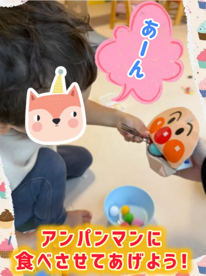 ポンポンが口に入るたびに、アンパンマンがもぐもぐ・・・「おいしい~💓」と言うのが面白かったようで、ポンポンが無くなりそうになると、先生に「もっと入れて!」と訴えるおともだちでした😊