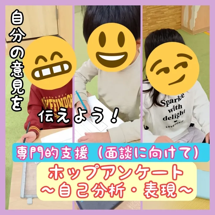 そのアンケートをもとに心理指導担当職員が子どもと一人一人面談を行い、ご自身の考えをお伝えする場を月に一度設けております✨️