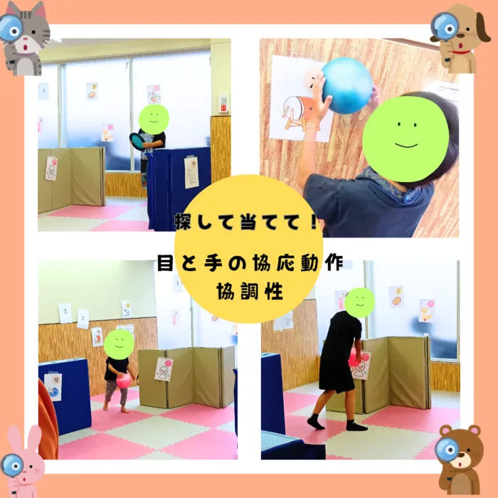 ひらがな・数字が書かれたカードを、お部屋の中の好きなところに貼ってもらいます🙌制限時間内に、スタッフが指定したカードにボールを当てていきました!