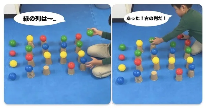 逆さまの紙コップの上にボールをバラバラに並べ、縦の列にそれぞれ色を割り振ります。