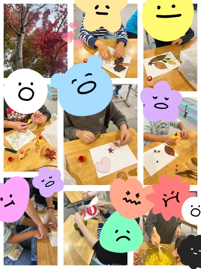 葉っぱを組み合わせて動物の形を作ったり、色とりどりに並べたりと自由に飾りつけ、11月のカレンダーに貼り替えをして完成です🍁
