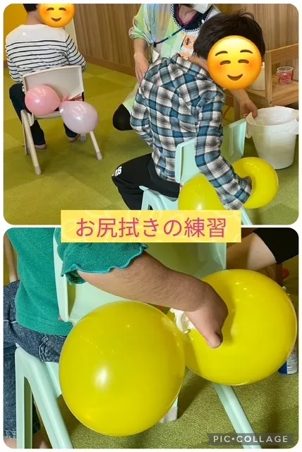 椅子に風船🎈2つを結びつけてお尻に見立て、ムースをお尻(風船)につけてトイレットペーパーで拭き取る、という流れを実践しました。