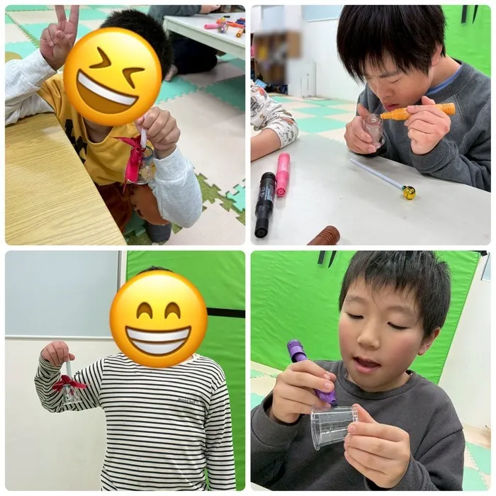 ベルの色、持ち手の色を選び自分で透明コップに色をつけたり、好きなキャラクターや、文字を書いたりして、ストローを通し、リボンの色を選んで取り組みました🎀
