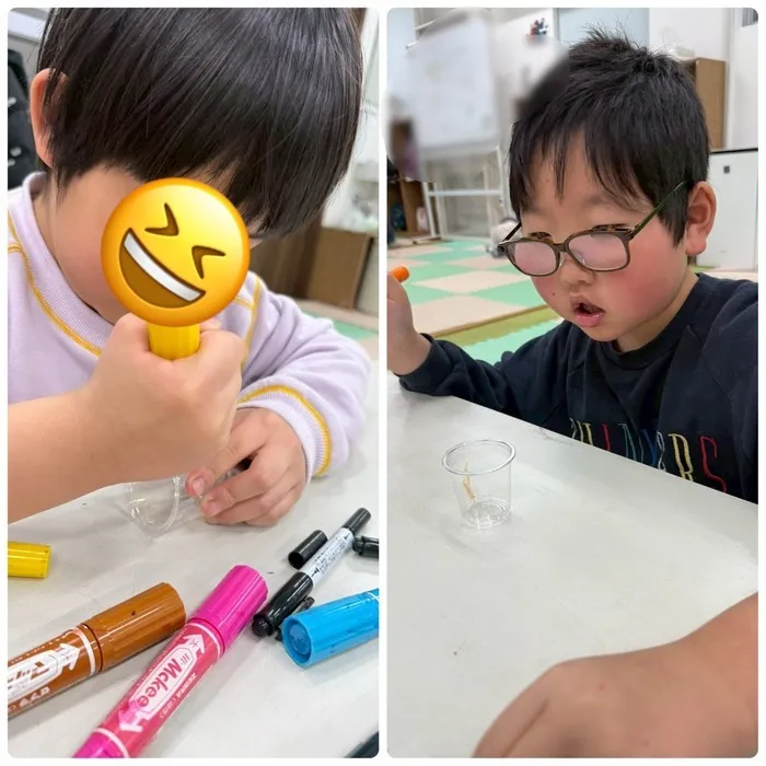 ベルの色、持ち手の色を選び自分で透明コップに色をつけたり、好きなキャラクターや、文字を書いたりして、ストローを通し、リボンの色を選んで取り組みました🎀