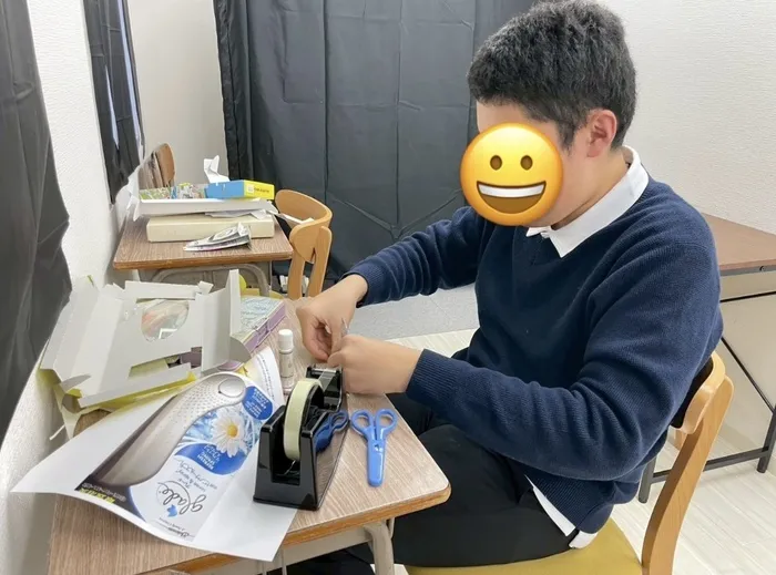 パソコンで見本となる画像を印刷して、最初は絵を描くだけかな?とスタッフは見守っていましたが、絵を描き終わると、「厚紙をください」とスタッフに頼み、本物の消臭スプレーの様に立たせる事ができる様になっていました👏🏻✨