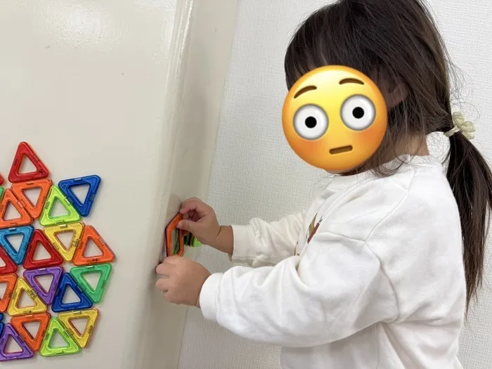 マグネットブロックを組み合わせて、いろんな形にしたり色や形ごとにくっつけて楽しんでいた女の子👧