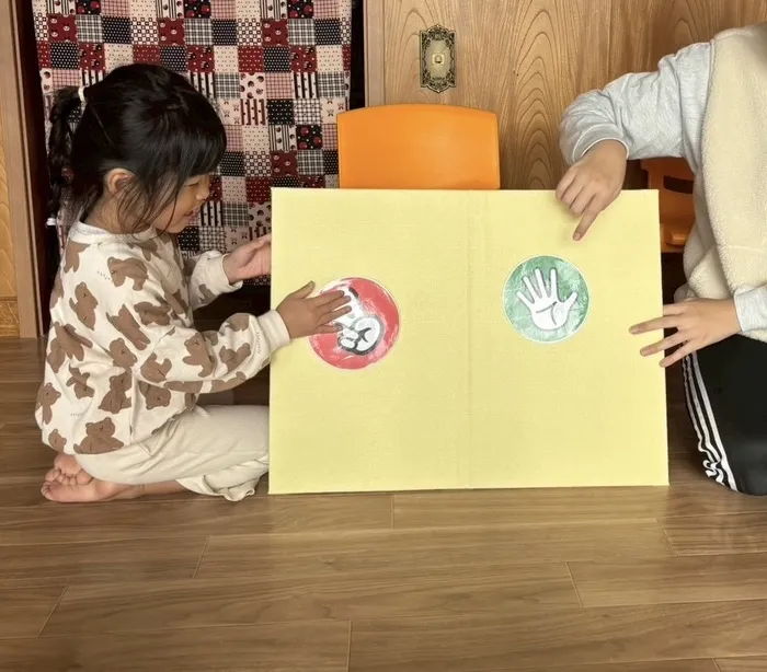 リズム遊びの時間に「パパパ」という歌にちなんでみんなでジャンケンゲームをしました☆先生に勝つのはどの手かな?負けるのは?あいこは?一緒に考えながらパネルに貼りました♪