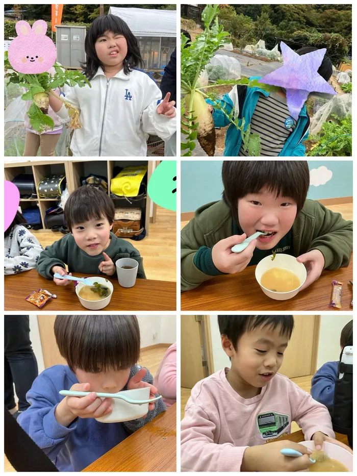 収穫した大根でお味噌汁を作りおやつで提供しました😋