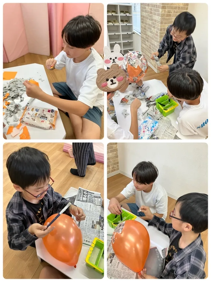 色の画用紙や新聞紙を細かくちぎってもらい、風船にひとつずつ丁寧に貼ってもらいました❗️