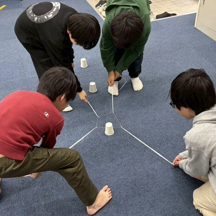 チームで協力して紙コップを運ぶゲームをしました🤝🏻
