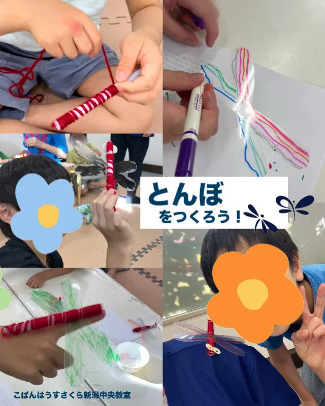 まずはくるくると手を動かしながらストローに毛糸を巻いて赤とんぼの体を作っていきます🧶とんぼの羽は子どもたちのイメージする色や模様をつけてカラフルに🎨目をくっつけて可愛らしいトンボが完成すると先生の肩にとまらせたり指に乗せてみたり、空を飛ぶように動かしてみたりと本物のとんぼの動きをよく知っている子どもたちに驚かされました!季節の移り変わりを感じながら楽しく活動できました💮