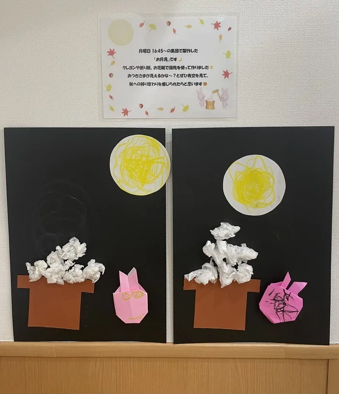 折り紙でうさぎを折ったり、クレヨンでお月さまの色を塗ったり、お花紙を丸めてお団子を作りました🐇
