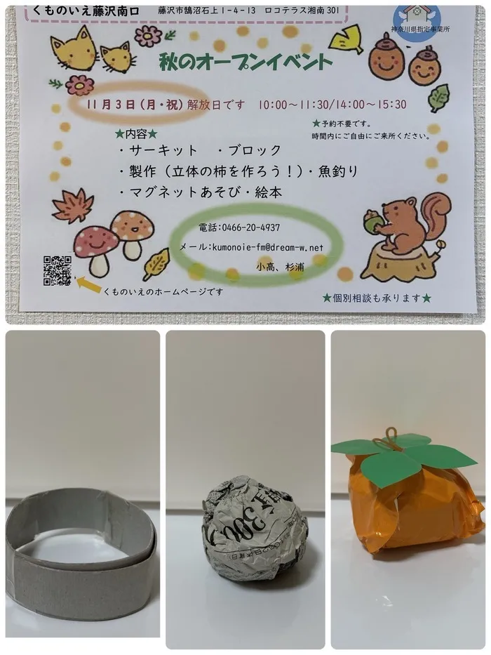 製作では秋の味覚の柿🍅を新聞紙、折り紙などを使って作ります。