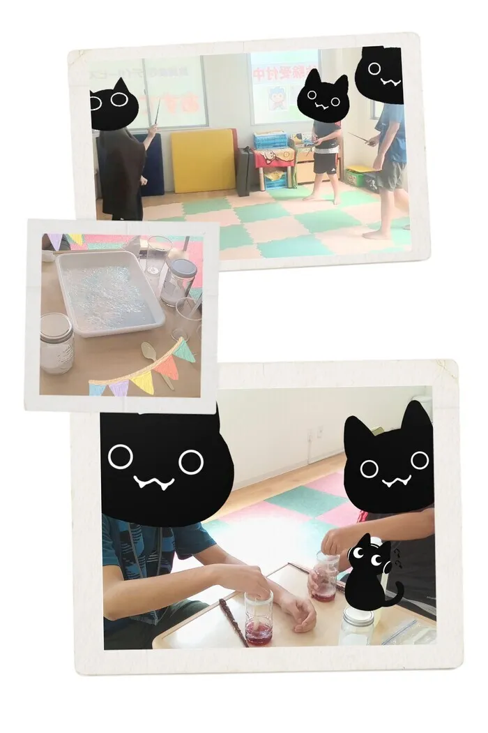 入学式で魔法の杖を贈呈し、呪文の勉強(呪文と動きを覚えます。ワーキングメモリを鍛える目的で行いました。)をしたらお楽しみの実験です!
