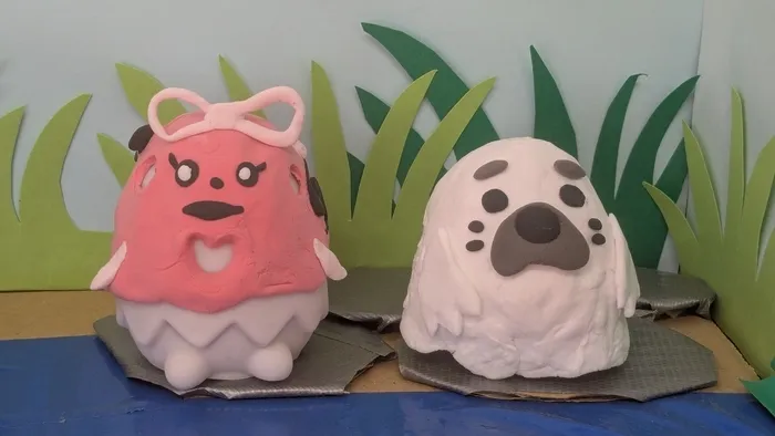 卵型の芯材の上に、絵の具で着色したクレイ粘土で作った生き物をのせるとかわいいランタンができあがります。