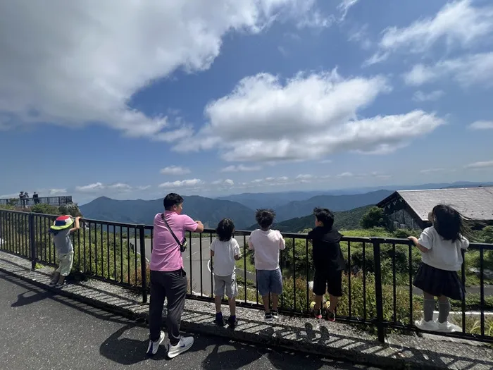 山々を見ながらみんなでお弁当を食べたり、ゆっくり景色を眺めてみんなとても大満足です✨✨四国カルストの映えスポットでもある県境でみんなで写真を撮りました😲😲帰りはみんな疲れて爆睡💤