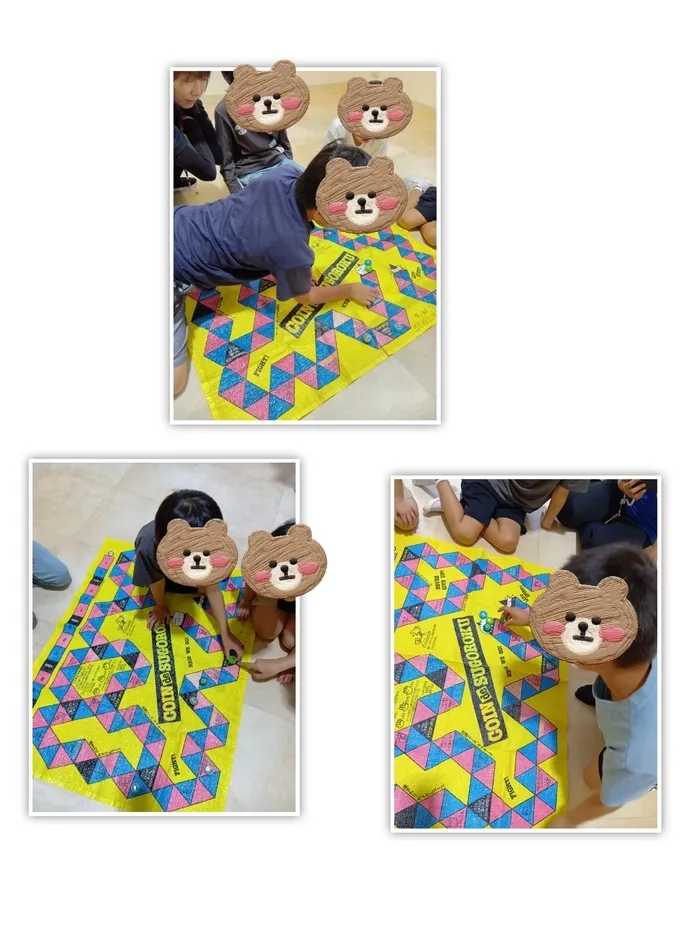 活動は【すごろく】をしました。子どもの協調性が身につく機会となります。 すごろくは数人で行う遊びであるため、ゴールまでスムーズに進めるには他のプレイヤーと協力したり、ゲームのルールを守ったりする協調性が必要とするものです。 これにより、子どもは自然と社会性や他者とのコミュニケーション能力を身につけることを目的としています😊