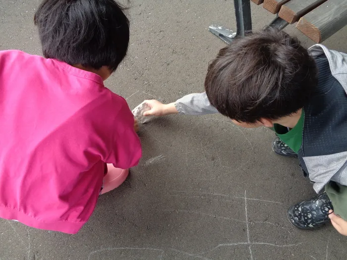 お話の後は早速、敷地内のアスファルトにチョークで自由に絵を描くこども達🎵