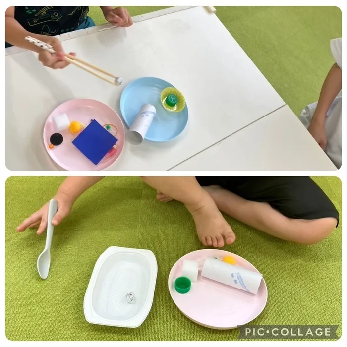 お皿にあるトイレットペーパーの芯やポンポンなどお箸やスプーンを使って取り組んでいます。