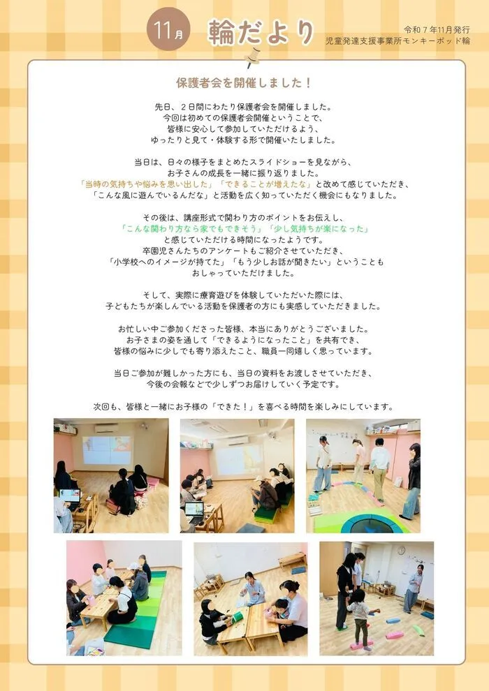 当日は、日々の様子をまとめたスライドショーを見ながら、お子さんの成長を一緒に振り返りました。「当時の気持ちや悩みを思い出した」「できることが増えたな」と改めて感じていただき、「こんな風に遊んでいるんだな」と活動を広く知っていただく機会にもなりました。
